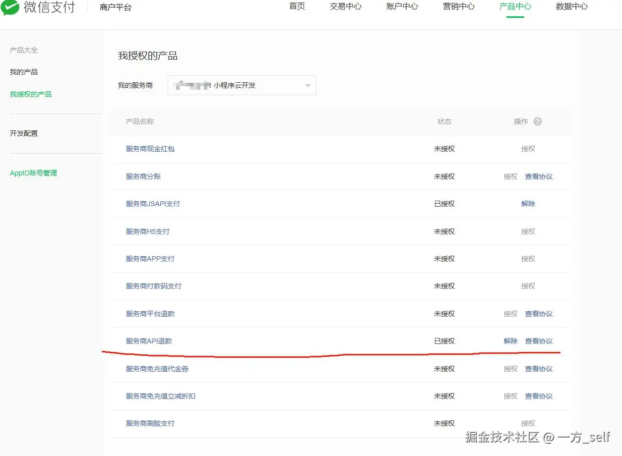 需要授权退款API权限,我这里已经授权了,未授权的话会有授权按钮,点击后会提示等待商户审核