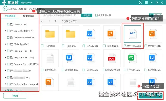 步骤2: 软件扫描结束后,在软件指定位置上选择自己需要恢复的文件后,点击目标文件后表示勾选,最后点击“导出”;