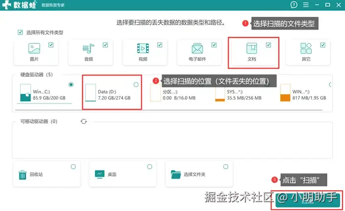 步骤1: 在电脑桌面上找到并打开数据 蛙恢复专家,在软件的主页面上选好自己需要恢复的文件类型后,再选择需要扫描的位置后,点击“扫描”;