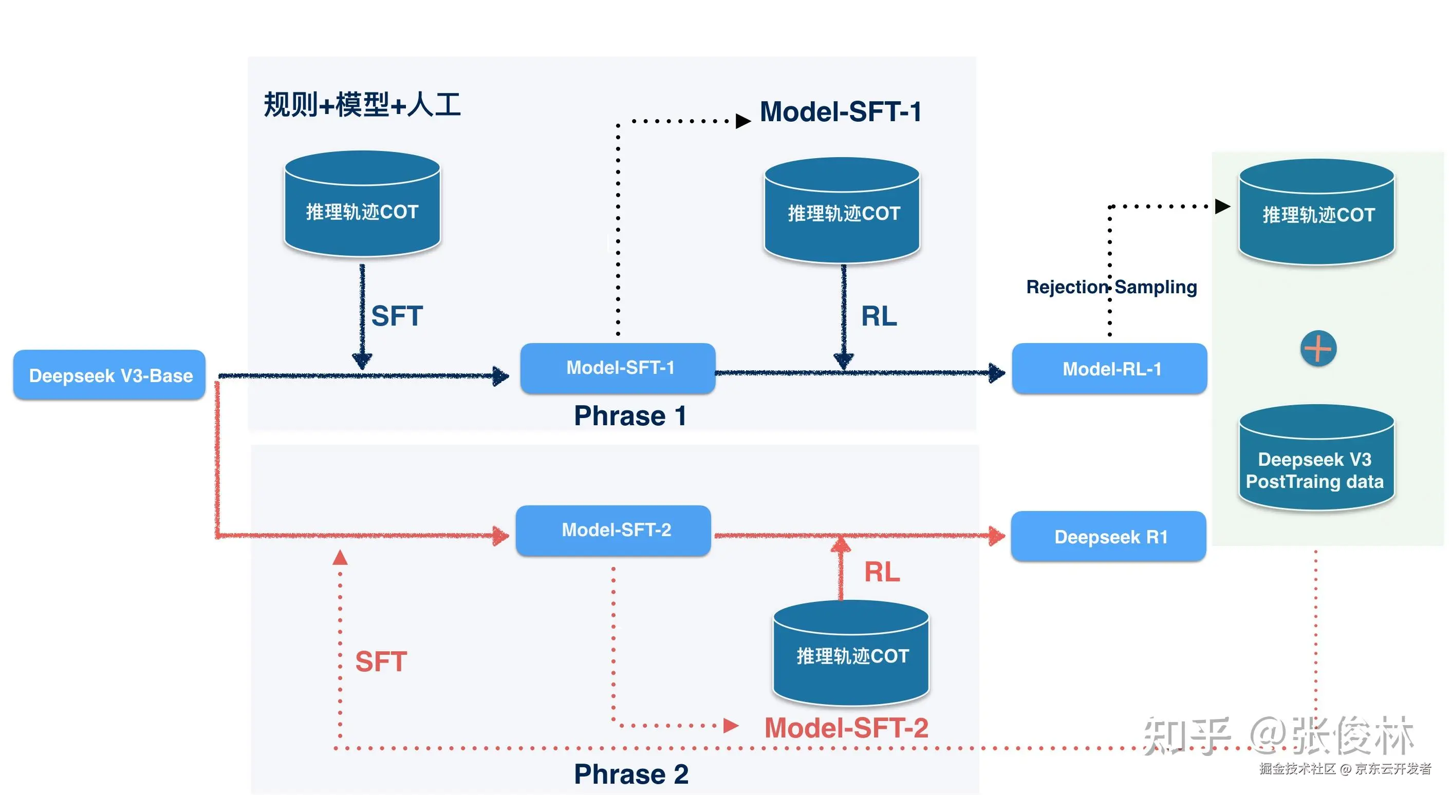 ◦关键策略:重新使用原始Deepseek V3 Base(非Phase 1的Model RL-1,是为了避免使用低质量数据污染的基座)。