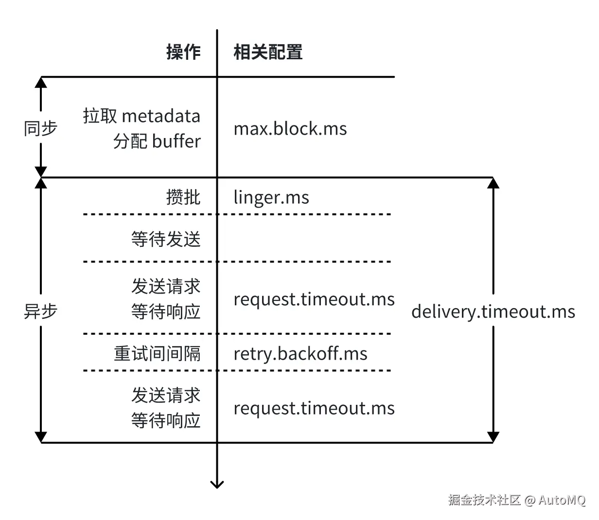 Kafka Producer 定义了一系列超时相关的配置,用于控制发送消息的各个阶段允许耗时的最大值。梳理如下图: