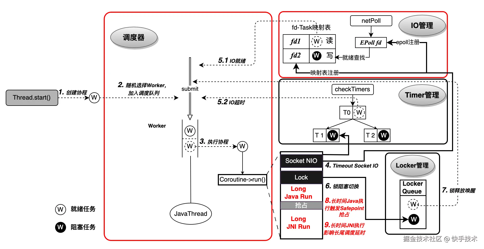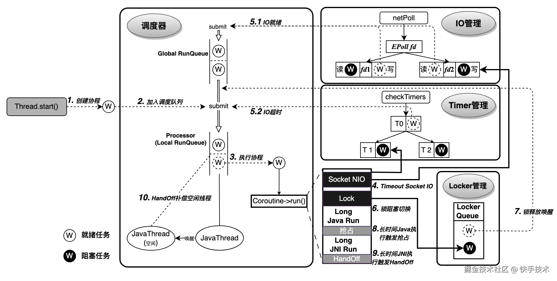 通过上述一系列调度器、IO 管理、任务抢占等关键架构模块的深入优化和重构,我们最终完成了快手 Java 协程架构的整体升级,新架构如下: