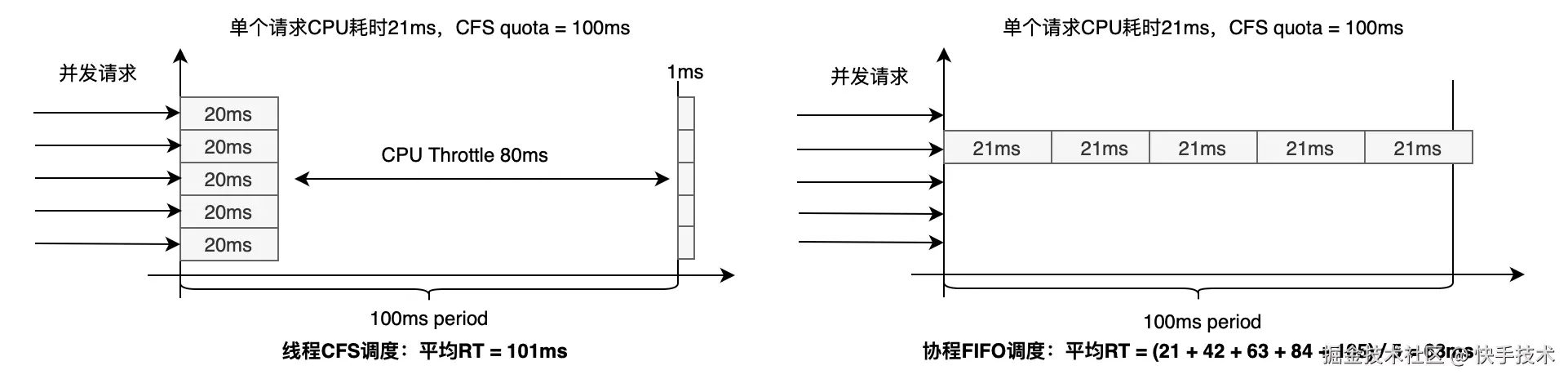 业界普遍认为,协程的主要优势在于减少了内核线程的上下文切换指令开销。然而,更为关键的收益在于协程显著改善了内核 CFS 的调度延迟。以下图为例,在云原生 k8s 环境中,当服务在单核 CPU 配额不足的高负载工况下运行时,线程的 CFS 公平调度策略可能引发 CPU Throttle,从而严重影响响应时间(RT)。相比之下,协程采用的 FIFO(先进先出)调度策略完全消除了 CPU 节流现象,将平均响应时间从 101ms 缩短至 63ms,显著提升了服务的 QPS 上限。