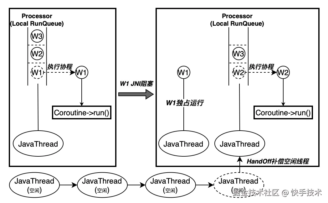 - 能够抢占 JNI 长任务:HandOff 通过补偿空闲线程的方式,巧妙得实现了对于 JNI 长任务的抢占。