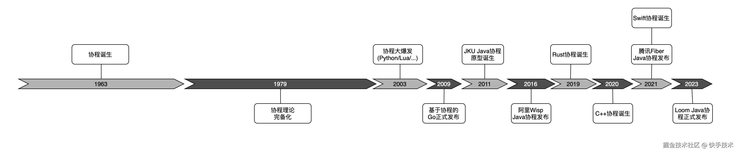相较于其他语言,Java 在协程方面的发展起步较晚。2011 年,JKU 首次提出了 Java 协程的原型,并发表了一系列具有指导意义的论文,为 Java 协程的实现指明了方向。自此,Java 协程进入了快速发展阶段,各大厂商纷纷推出了各具特色的 Java 协程解决方案,如阿里的 Wisp 协程方案、腾讯的 Fiber 协程方案以及 Oracle 官方的 Loom 协程方案等。其中,Oracle 官方的 Loom 协程方案自 2018 年启动以来,备受瞩目,并在 2023 年的 Java 21 版本中正式发布,引发了 Java 业界的广泛关注,被视为 Java 生态中的重要里程碑。