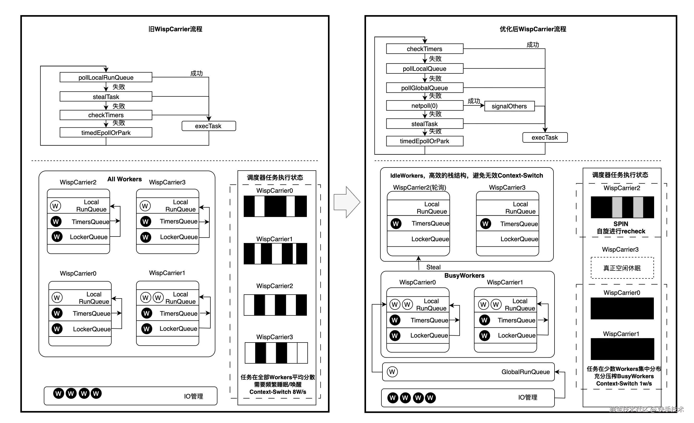 - 线程数最小: 在及时响应任务调度需求的前提下,保持尽可能少的活跃 WispCarrier 线程数,从而使得能 WispCarrier 尽可能连续执行任务,减少 Context-Switch。为了达到该目的,一方面,对业务的负载需求延迟满足,唤醒新的 Idle WispCarrier 保持谨慎,避免过度响应需求,而是通过合理策略充分压榨现有资源潜力,减少活跃线程数;另一方面,打破传统调度器设计中不同任务类型(如 RunQueue、IO、Timer)各自拥有独立调度线程的惯例,改为 WispCarrrier 在执行任务间隙兼顾 IO/Timer 调度,减少额外线程带来的系统资源消耗。