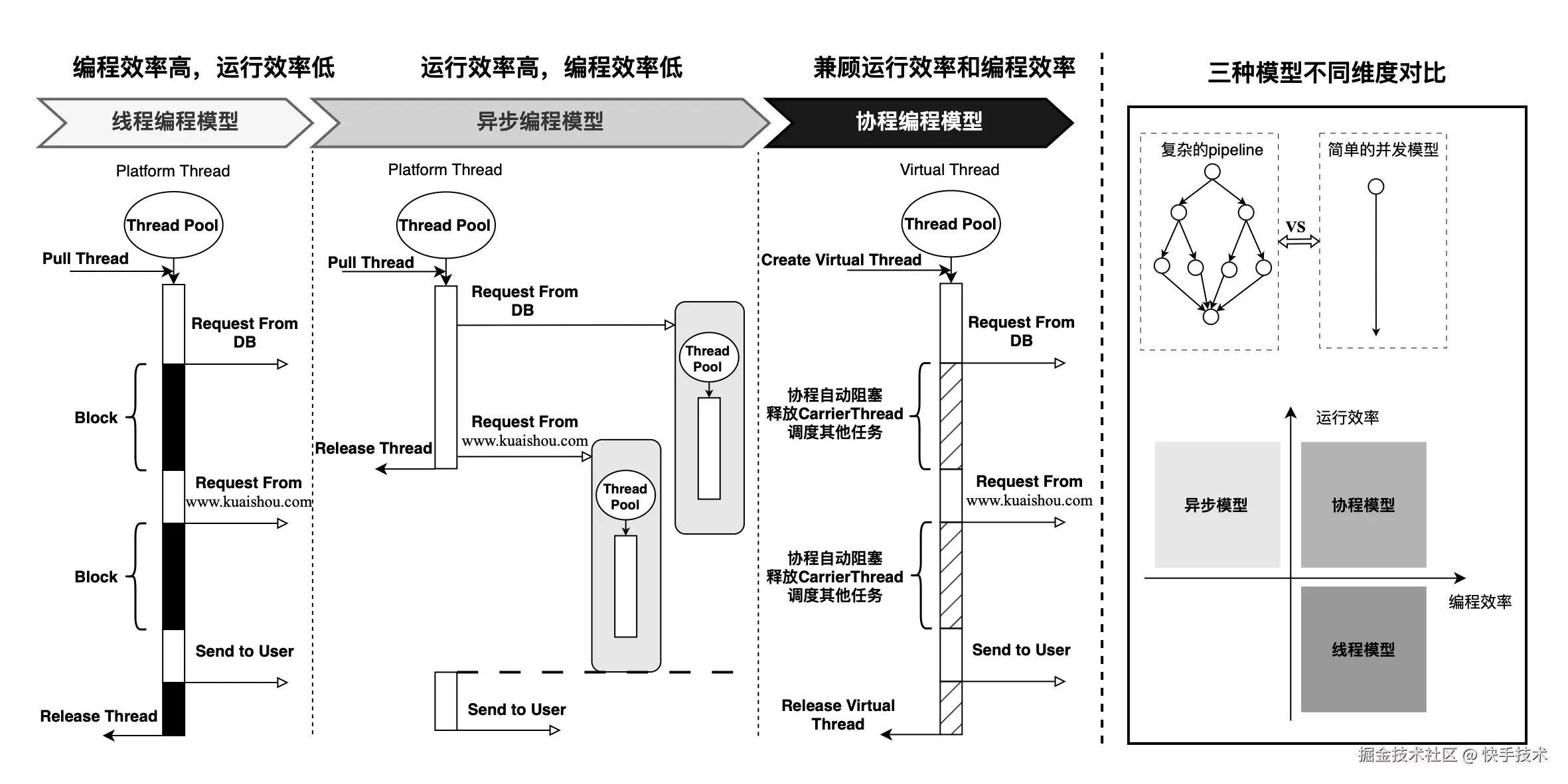 摘要:对于开发者而言,传统线程模型逻辑直观但性能受限,而异步模型虽性能高却复杂性大。协程以“同步编程,异步执行”平衡两者,成为现代语言标配。结合自身业务需求,快手基于社区开源版本自研了 Java17 透明协程技术,实现对业务无侵入的同时,吞吐能力提升 30%以上。本文将深入剖析快手协程技术的背后原理与架构演进。