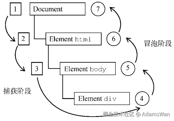 DOM2 Events 规范规定事件流分为 3 个阶段:捕获阶段、目标阶段、冒泡阶段