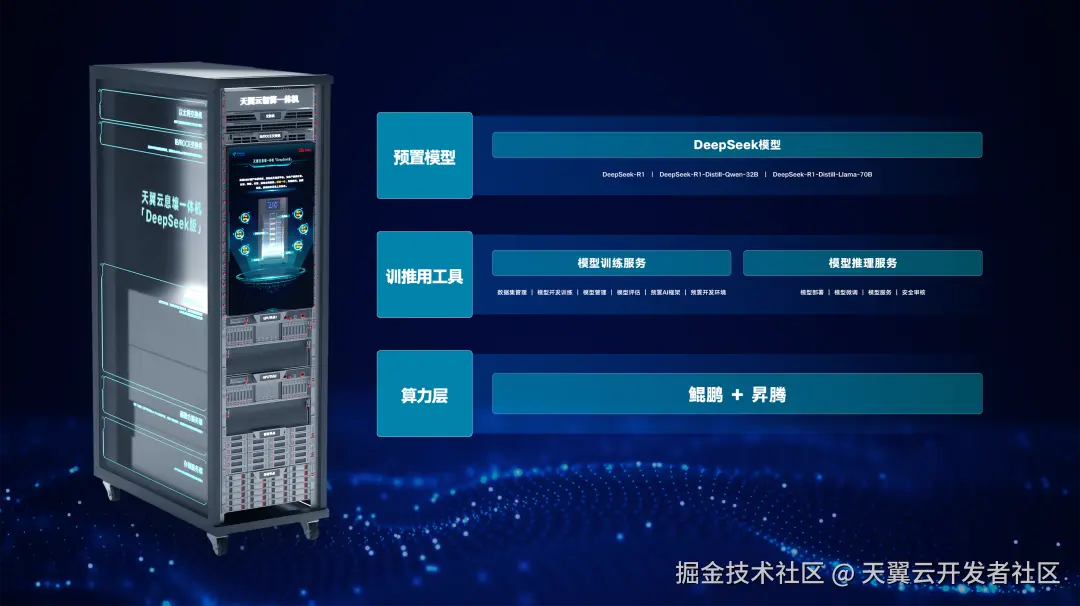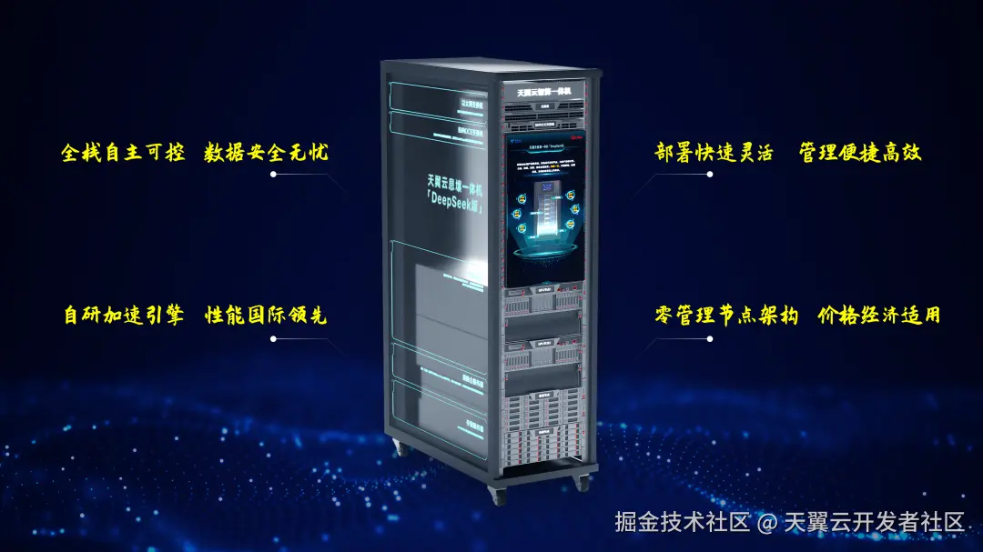 为了满足企业的私有化、国产化部署需求,2月10日,天翼云正式推出息壤智算一体机-DeepSeek版,为各行各业提供性能卓越、安全可控的智能算力解决方案。作为天翼云“息壤”智算平台的重要延伸,息壤智算一体机-DeepSeek版集国产算力、国产模型和国产云服务于一身,深度融合了DeepSeek-R1/V3系列大模型,实现了从芯片、推理引擎到模型服务的全栈国产化。这一创新设计,不仅确保了技术链路的自主可控,更为企业智能转型插上了坚实翅膀,引领国产AI领域迈向新高度。