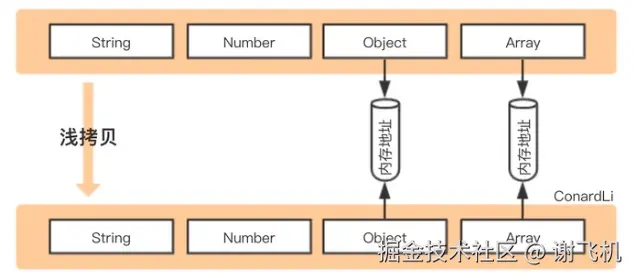 - 浅拷贝是创建一个新对象,这个对象有着原始对象属性值的一份精确拷贝。如果属性是基本类型,拷贝的就是基本类型的值,如果属性是引用类型,拷贝的就是内存地址 ,所以如果其中一个对象改变了这个地址,就会影响到另一个对象。