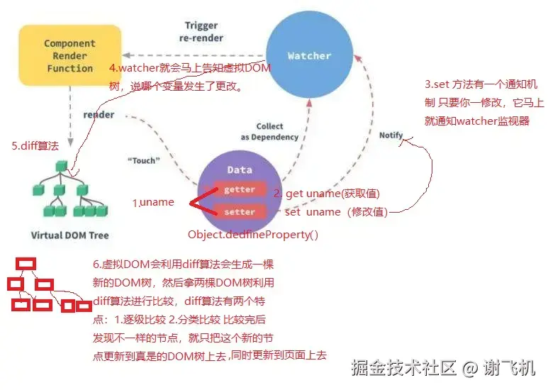 单项绑定过程(自己总结的):变量变了,由set发通知给watcher,watcher告知虚拟DOM树,叫它该比较了,我这有值变了,于是生成新的dom树进行一个比较,然后逐级分类比较,比较出哪个元素发生变化就把这个元素更新到页面,这就是单项数据绑定原理。