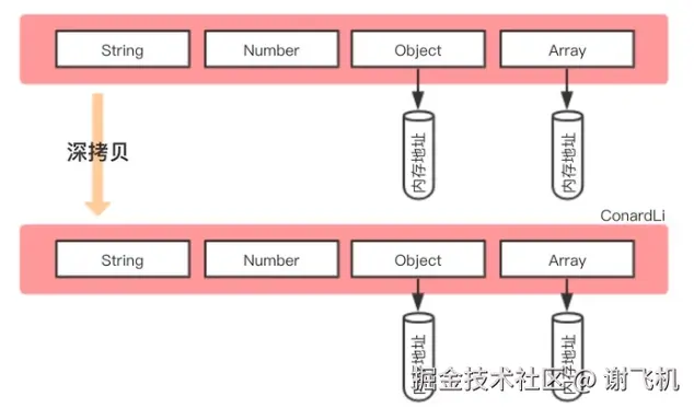 - 深拷贝是将一个对象从内存中完整的拷贝一份出来,从堆内存中开辟一个新的区域存放新对象,且修改新对象不会影响原对象。