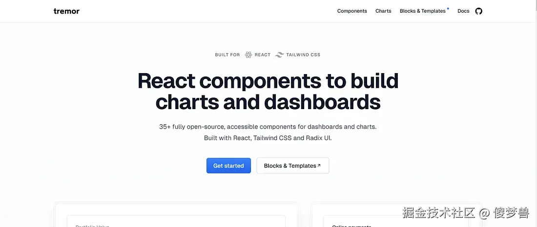 Tremor是一个专为仪表盘和分析界面设计的低层级UI组件库。它提供了丰富的预构建组件,如图表、布局和输入元素,既能满足美观的默认设计,也支持完全自定义。通过使用其“Blocks”功能,你可以快速上手并组合出复杂的界面。如果你正在开发数据密集型的应用,Tremor绝对值得一试!