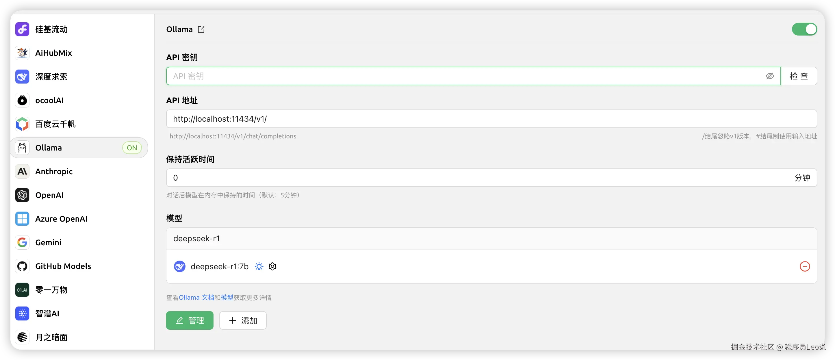然后在管理中添加我们刚安装过的 deepseek-r1 的版本。