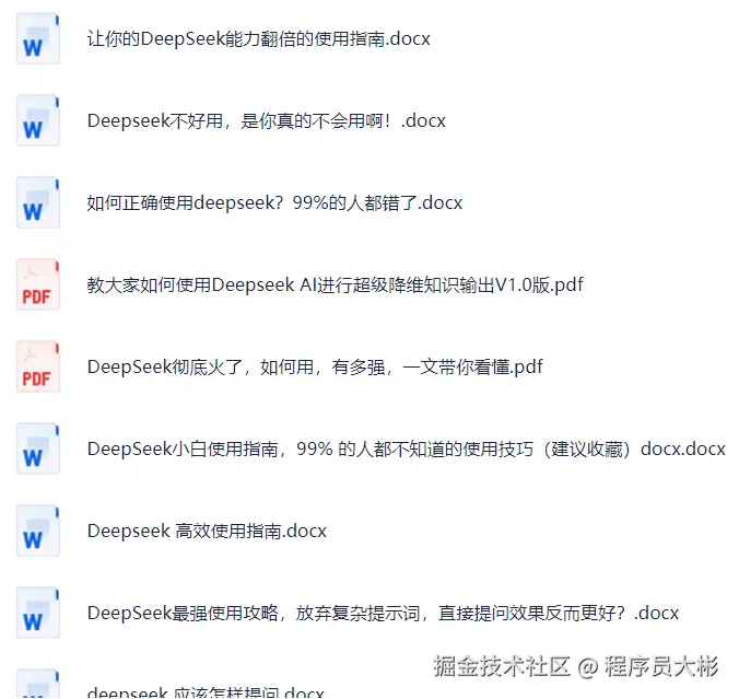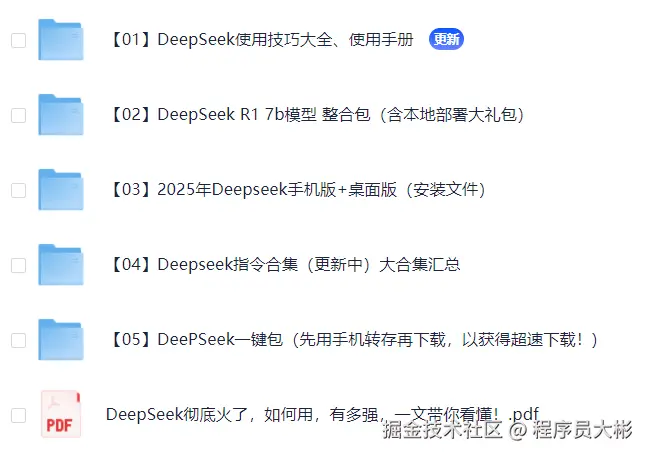 最后分享DeepSeek从入门到精通完整版手册、一键部署包、DeepSeek资源教程、使用技巧大全、指令合集汇总