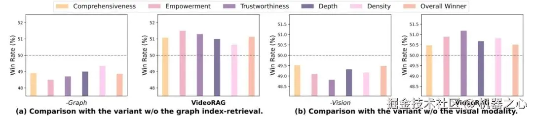 VideoRAG 的卓越性能:VideoRAG 在 所有维度指标和所有视频类型 上均显著优于 NaiveRAG、GraphRAG 和 LightRAG 等基线。说明基于知识图与多模态上下文编码的索引能够有效捕捉和组织视频中的视觉动态和语义信息,此外混合多模态检索范式通过将文本语义匹配与基于视觉内容嵌入的检索相结合,有效提升了跨视频检索精度;