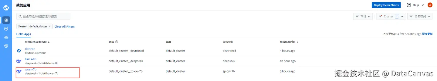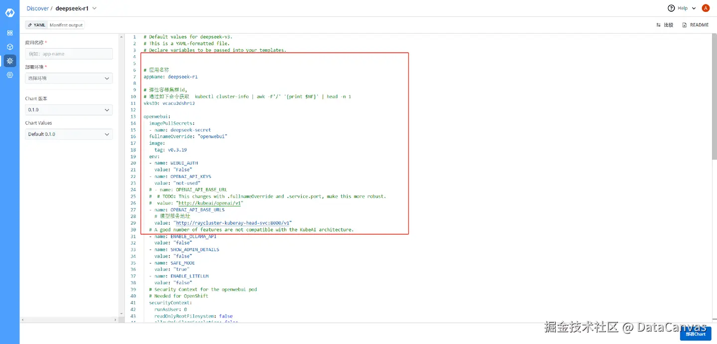 在部署DeepSeek应用时,不同的模型需要修改的values.yaml文件内容(下图的右侧可编辑部分)不同。
