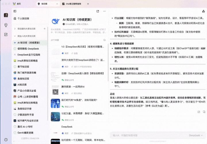 将 ima 更新至最新版本后,用户在使用搜、读、写和知识库的时候,可以选择腾讯混元大模型或 DeepSeek-R1 模型。