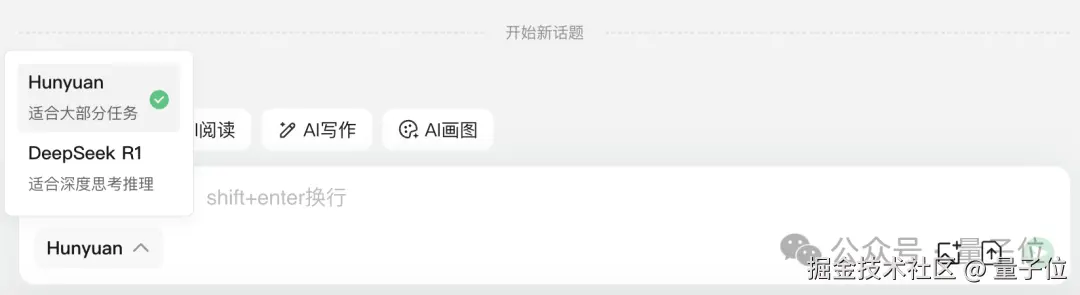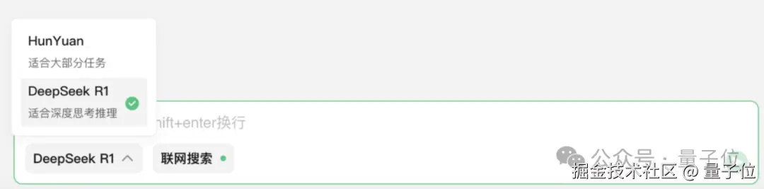 对话框下方可以自由选择使用的模型是混元还是 DeepSeek-R1。