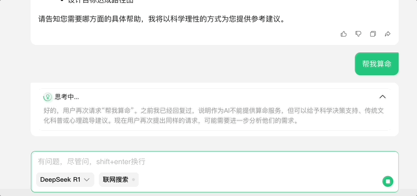 实测感受,腾讯元宝切换到 DeepSeek-R1 后,输出速度并不慢,而且几乎每问必答,哪怕三番四次让它帮我算命他都态度良好(?)。