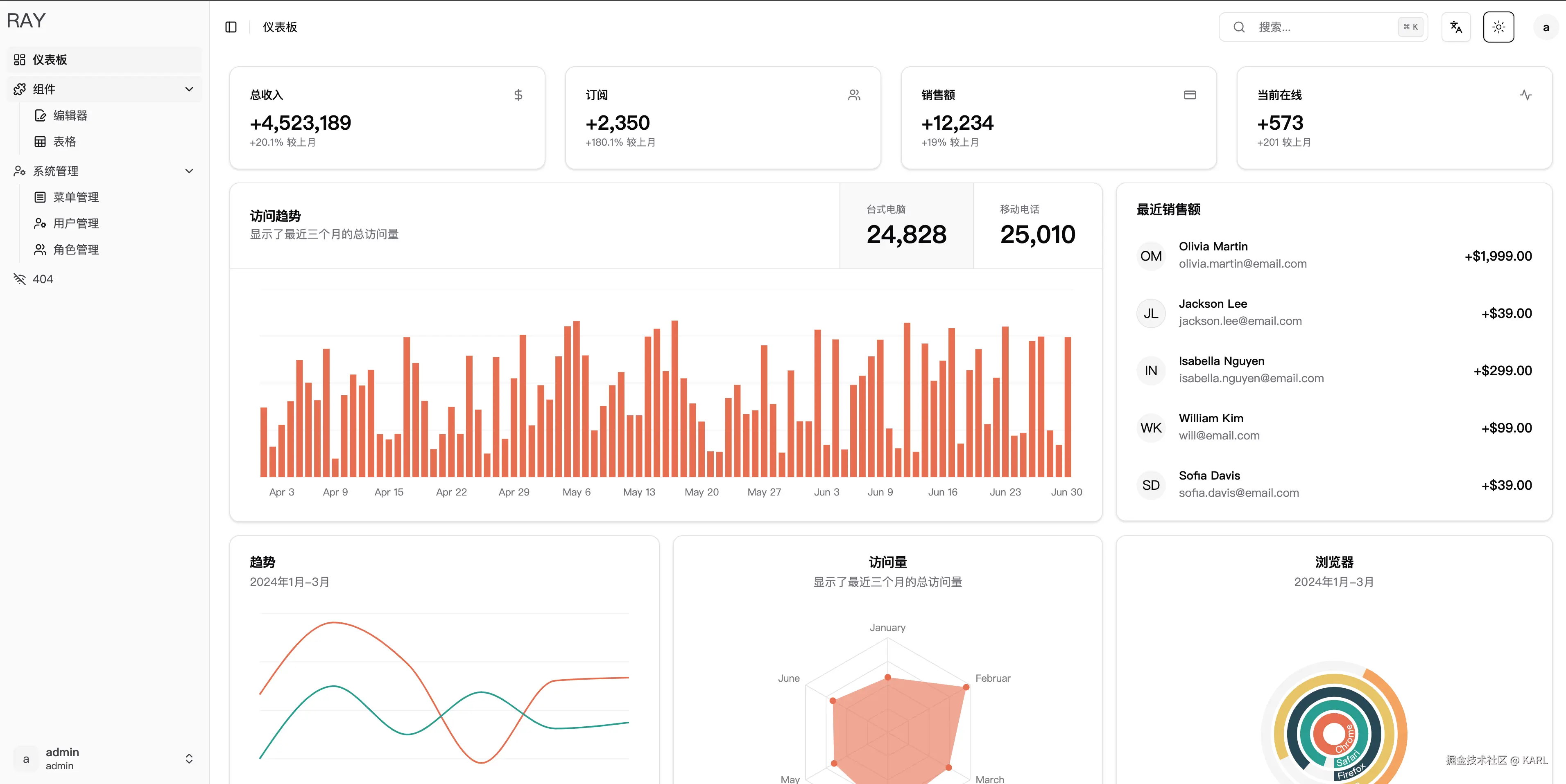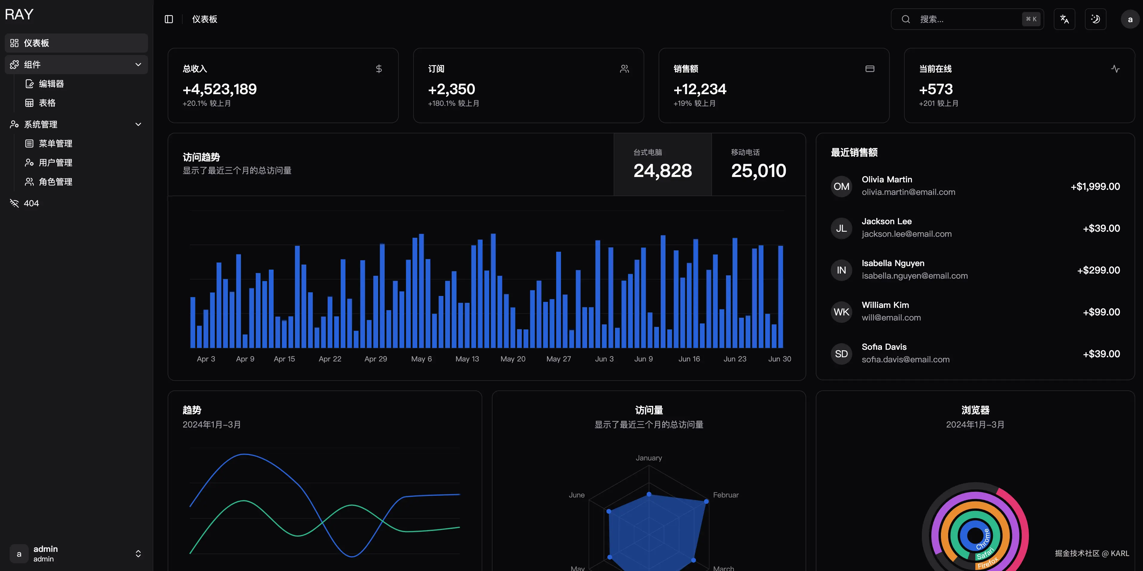 Ray是一个免费开源的全栈中后台模板,采用了 Next、TRPC、Prisma、Shadcn、TypeScript 等主流技术开发,开箱即用,项目已被T3官方收录, 可用于中后台全栈开发,也适合学习参考。