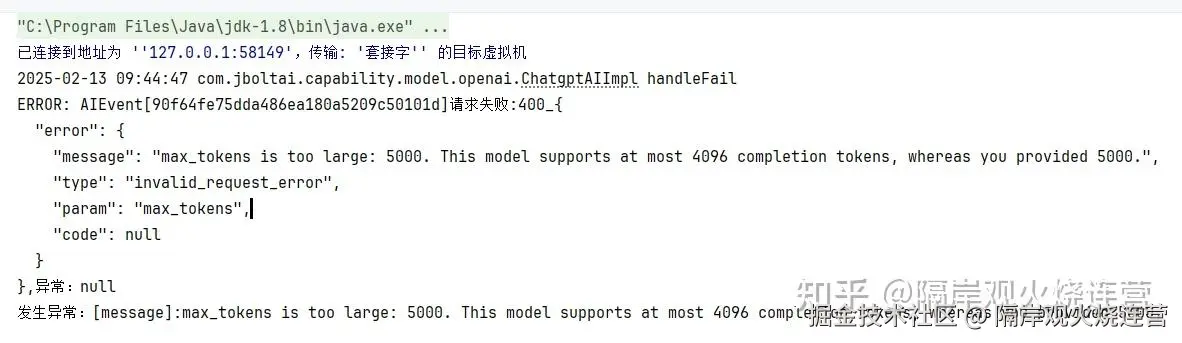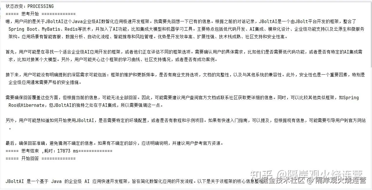 JBoltAI.chat().setModelName("Pro/deepseek-ai/DeepSeek-R1").prompt("你了解JBoltAI这个Java 企业级 AI 数智化应用极速开发框架吗").setMaxTokens(2000).setTemperature(0.2).onThinking((e, think, status) -> {if (status == ThinkStatus.START) {System.out.println("===== 思考开始 =============");} else if (status == ThinkStatus.RUNNING) {System.out.print(think);} else if (status == ThinkStatus.COMPLETE) {System.out.print(think);System.out.println("===== 思考结束 ,耗时:"+e.getThinkDuration()+" ms=============");System.out.println("===== 开始回答 =============");}}).onSuccess((e,msg) -> {System.out.print(msg.getContent());}).onFail((e, error) -> {System.out.println(error.getMsg());}).onStateChange((event, state) -> {System.out.println("状态改变:" + state);}).publish().await();