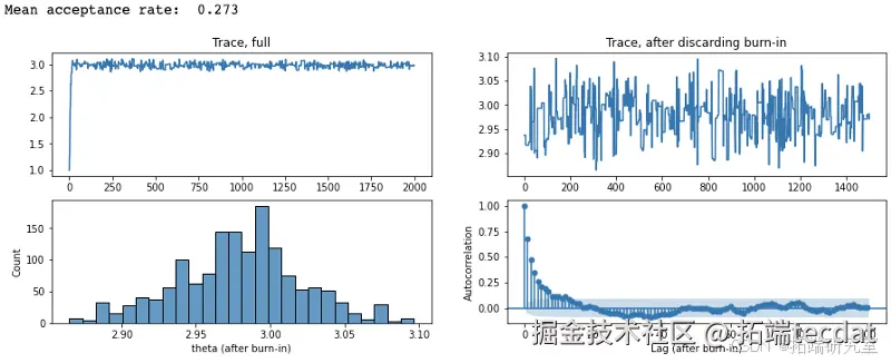 通过绘制参数值的轨迹图、分布图和自相关图,可以分析MCMC的收敛情况和后验分布的特征: