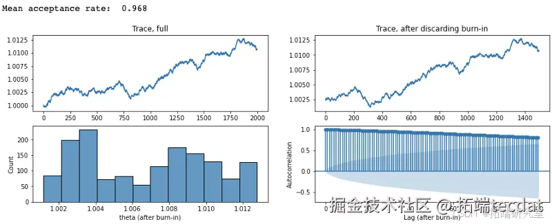 - 根据接受概率决定是否接受新参数值:如果接受概率大于从均匀分布中采样得到的值,则接受新参数值,否则保留当前参数值。
