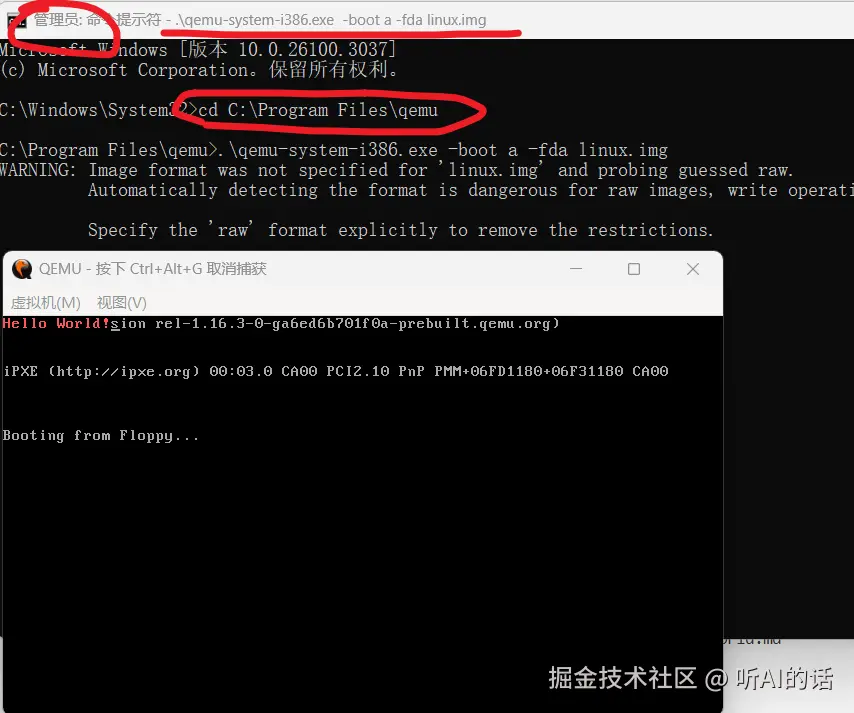 如果使用 QEMU 运行,则需要将 linux.img 复制到 QEMU 所在的目录(C:\Program Files\qemu)中,然后在QEMU 文件路径中打开 PowerShell 或者cmd,并执行如下命令: