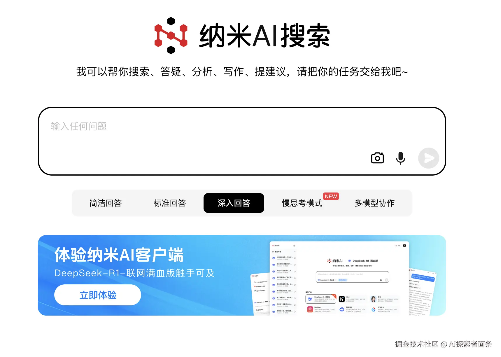 - 特点:这是 360 旗下的纳米 AI 搜索,它搭载了满血联网版 DeepSeek 模型,十分强大。要是你平时关注周鸿祎的动态,就会发现他最近搞的抽汽车活动都在大力主推这款软件。想必功能上肯定表现不俗。