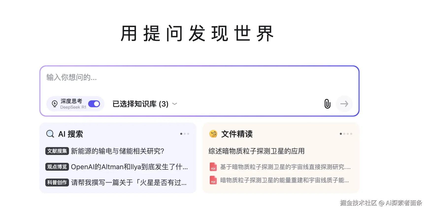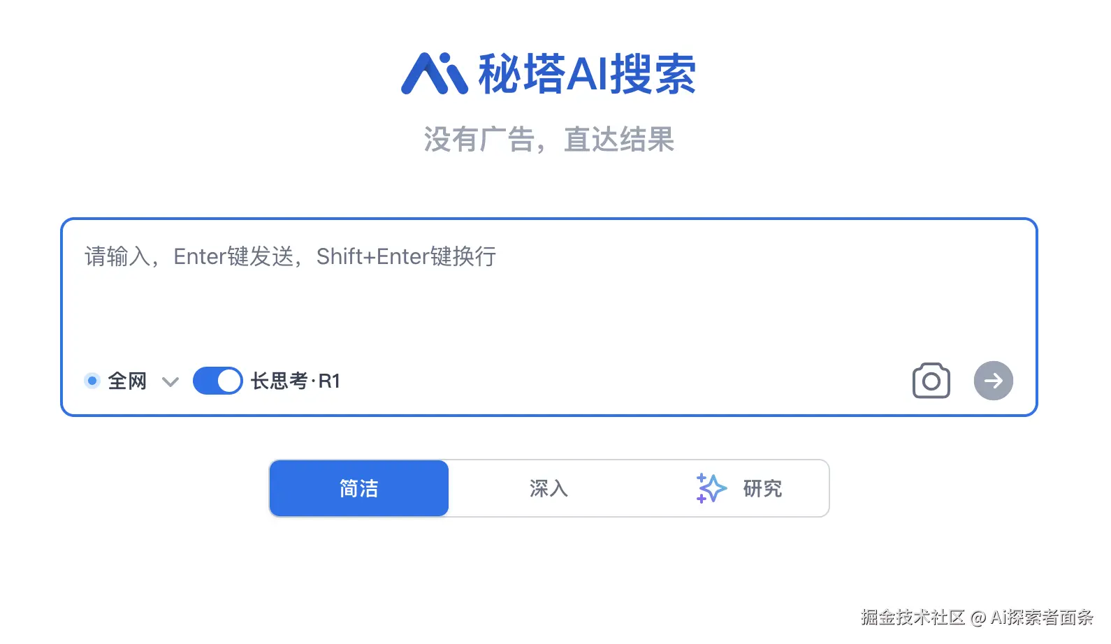- 特点:秘塔 AI 搜索可是去年 AI 搜索引擎界的“网红选手”,备受大家青睐。如今,它接入了 DeepSeek 的 R1 模型后,如同被注入了强大的“智慧能量”,功能更上层楼。它就像是你身边一位贴心且博学的助手,不仅能深入搜索海量信息,还能帮你深度思考,挖掘信息背后的价值,实力不容小觑。使用起来也超级简单,直接打开网页就能开启你的探索之旅。