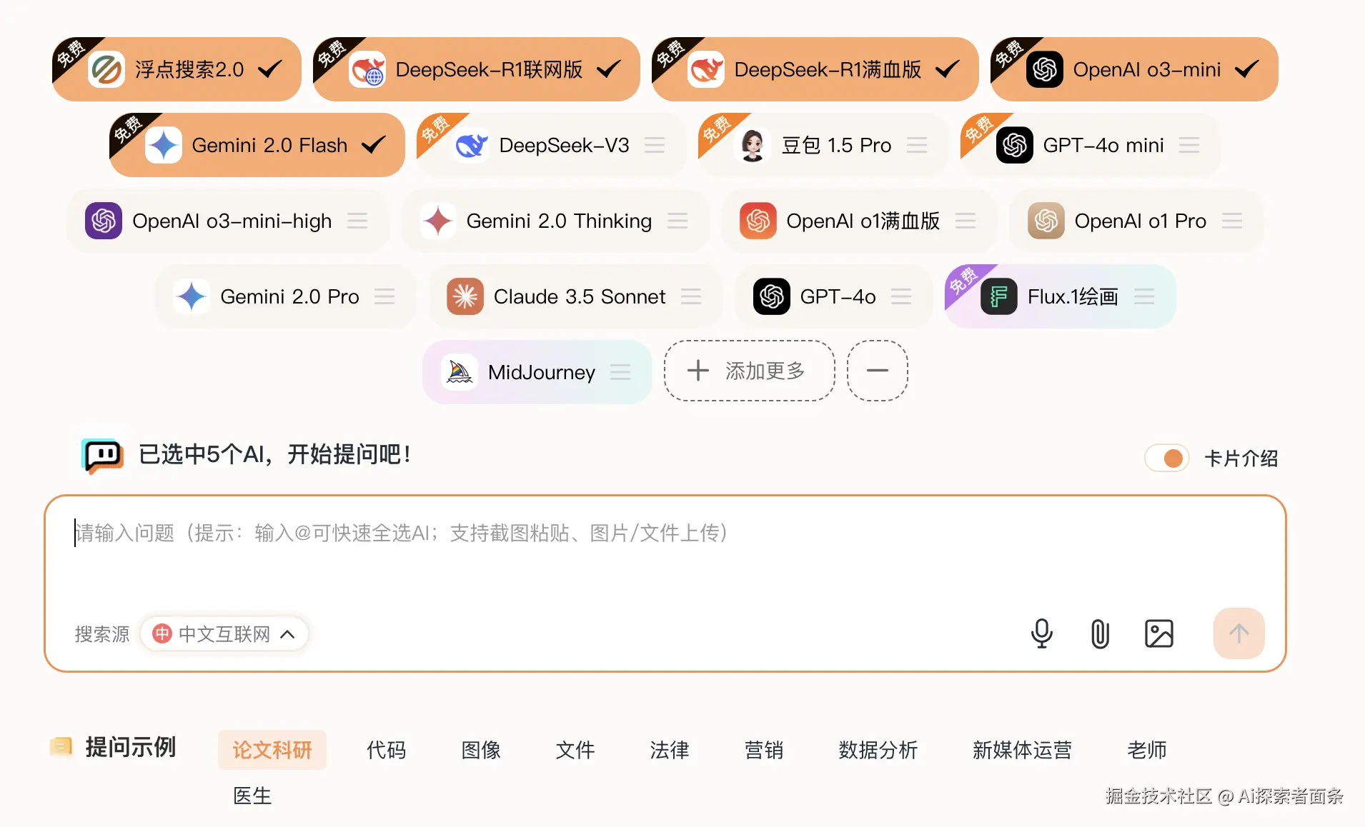 - 特点: AskManyAl 的“肚量”可大了,里面汇聚了很多主流大模型。现在你还能免费使用 DeepSeek 的 R1 模型。我亲自测试体验了一番,它的响应速度相当给力,无论你是需要即时查找资料,还是渴望进行深入交流,它都能快速给出反馈,完全能够满足日常使用需求。