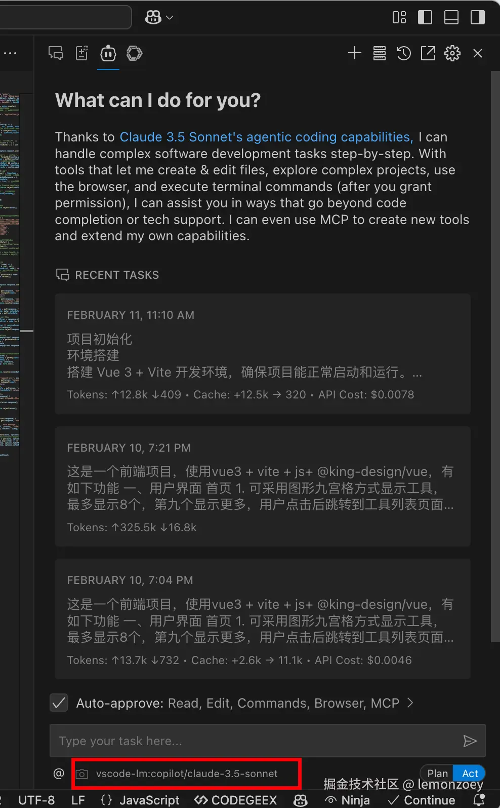 规划完成后,开发者可将DeepSeek R1方案交由Claude 3.5 Sonnet编码。作为最强编码AI,Claude 3.5 Sonnet在Act模式下代码生成能力卓越,适合基于明确规划执行任务。