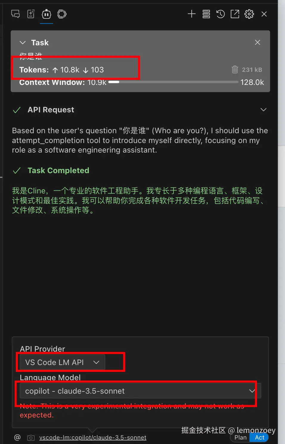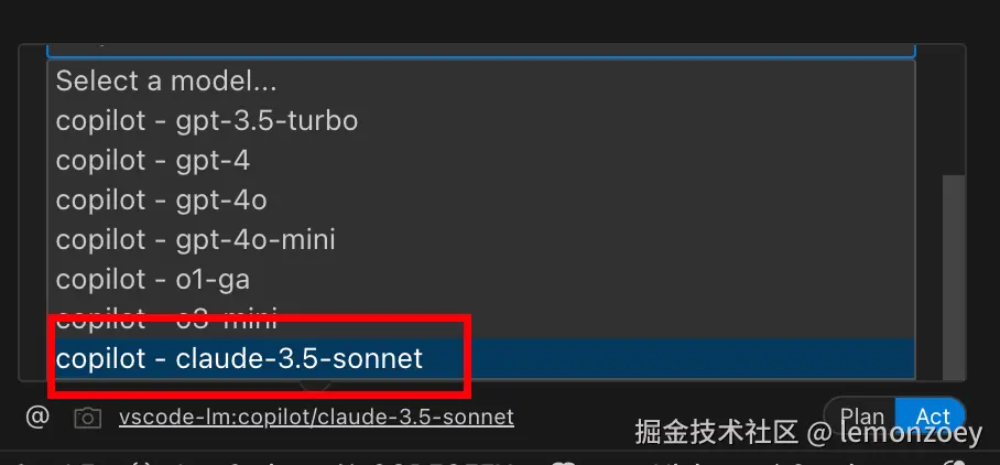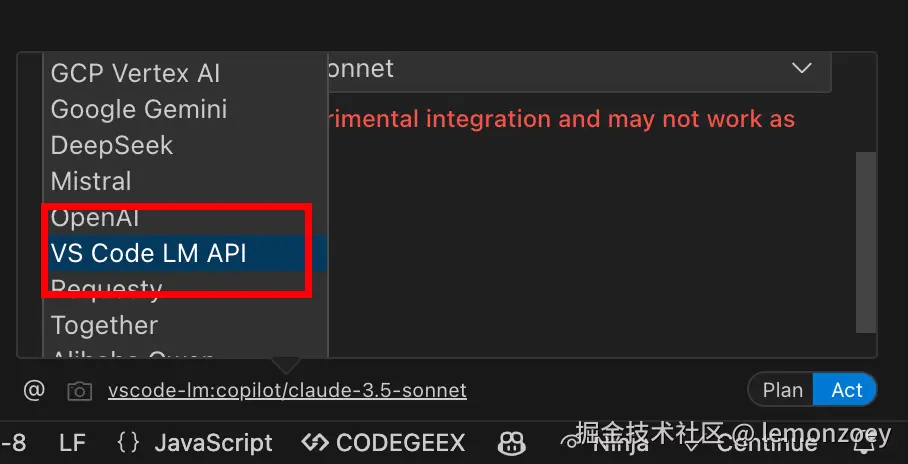 API Provider中选择 VS Code LM API,language Mpdel中选择copilot-claude-3.5-sonnet