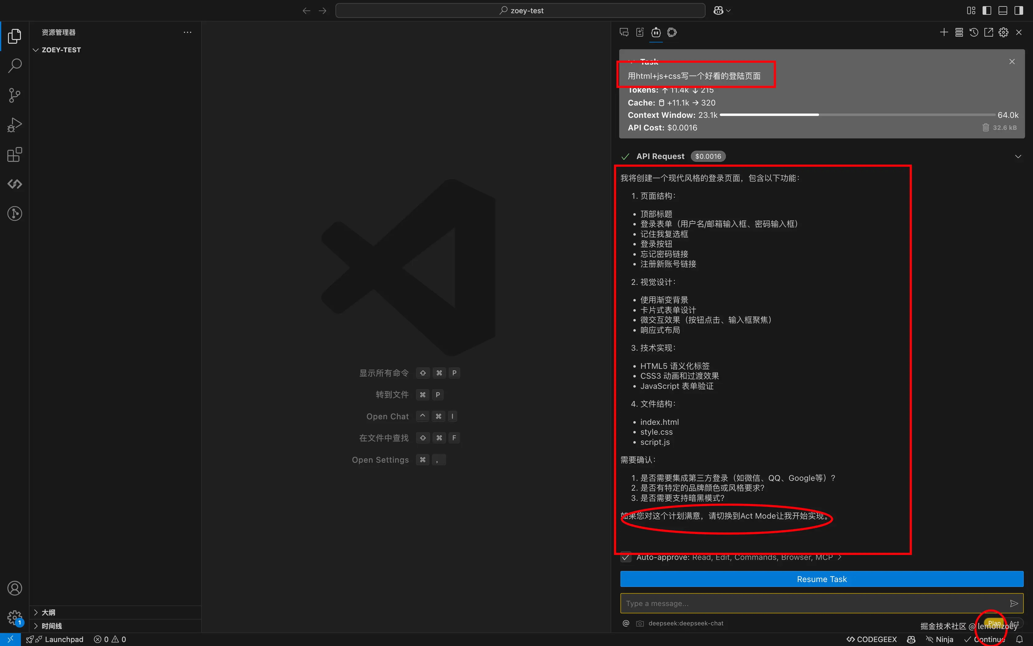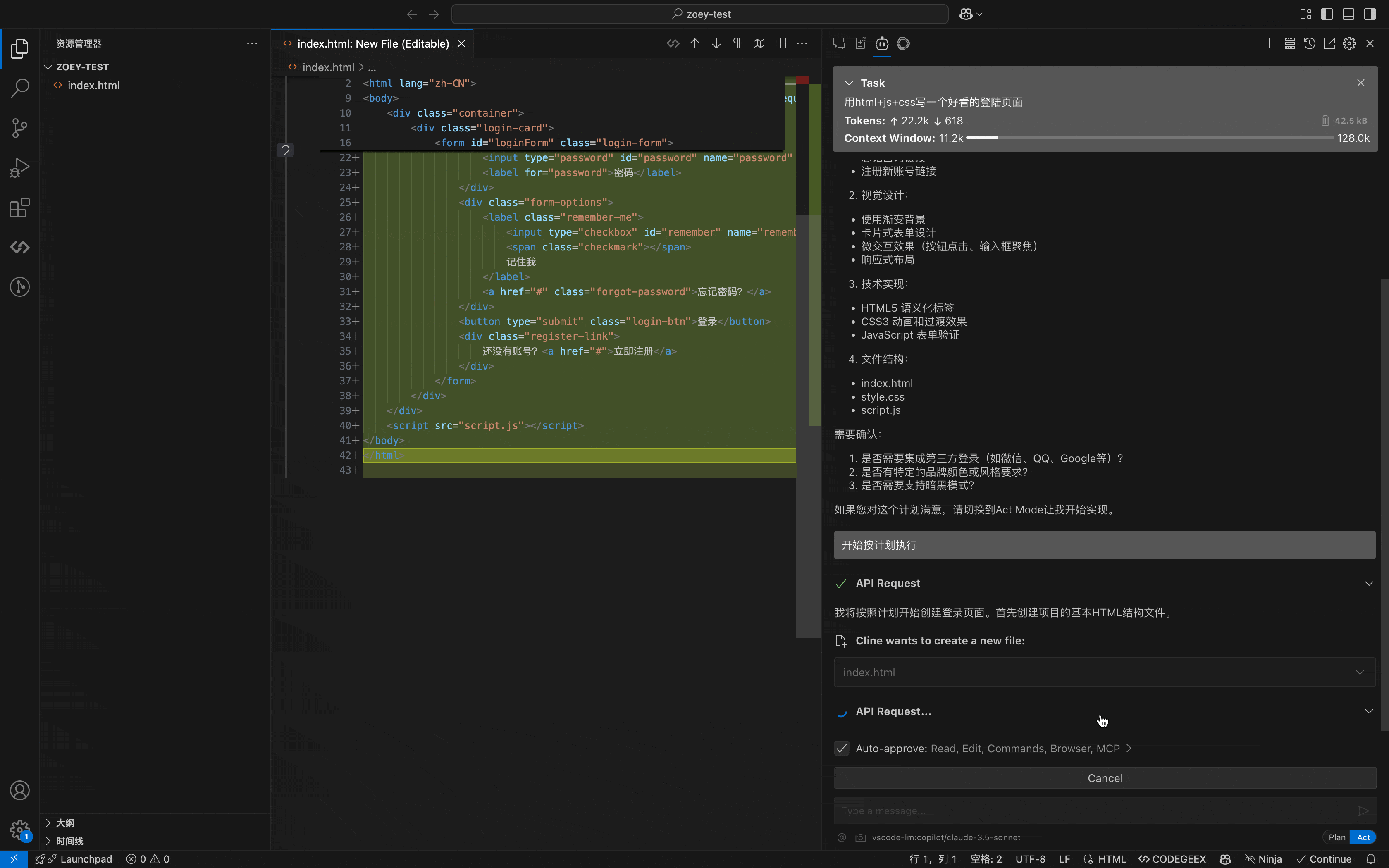 在确认了最佳方案后,开发者进入 Act Mode,将 DeepSeek R1 提供的架构设计交给 Claude,Claude 立即根据方案生成代码,快速实现功能。
