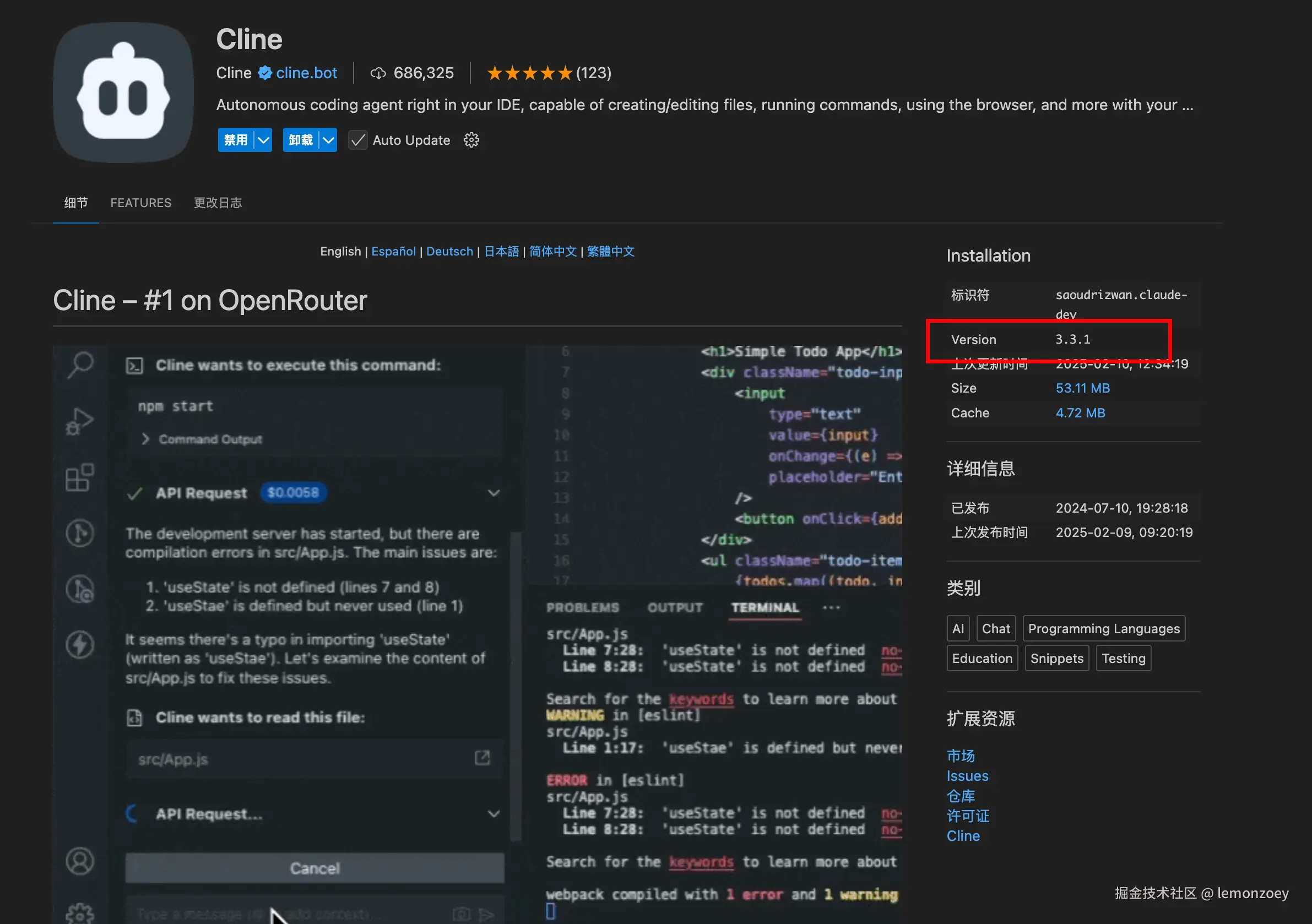 vscode插件搜索cline,目前最新版本是v3.3.1