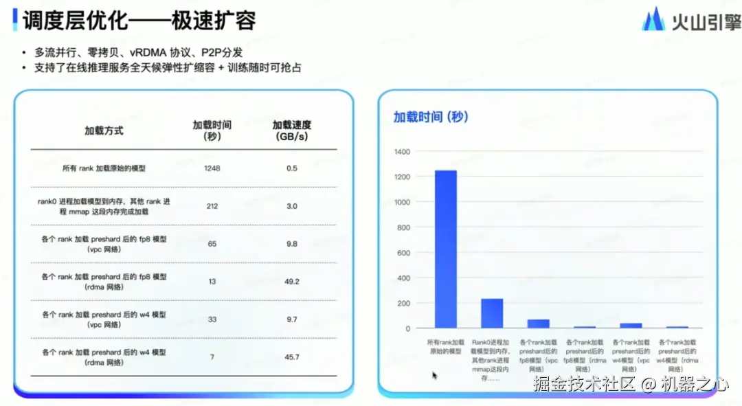 方舟推理工程优化专家徐子林表示:「DeepSeek-R1 满血版是一个非常庞大的模型,加上前后处理过程,总参数量可达 700B,而如果按照我们当前最极致的优化水平,可在 7 秒内完成模型的加载。」也就是说,当系统出现突发流量时,火山引擎可实现秒级响应,从而实现「用户侧的无感使用」。