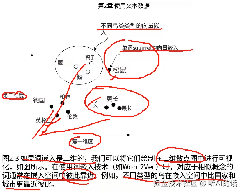 不幸的是,高维嵌入对可视化提出了挑战,因为我们的感官知觉和常见的图形表示本质上被限制在三个或更少的维度,这就是为什么图 2.3 在二维散点图中显示二维嵌入的原因。然而,当使用 LLM 时,我们通常使用具有更高维度的嵌入。对于 GPT-2 和 GPT-3,嵌入大小(通常称为模型隐藏状态的维度)根据特定的模型变体和大小而变化。这是性能和效率之间的权衡。最小的 GPT-2 模型(1.17 亿和 1.25 亿参数)使用 768 维的嵌入大小来提供具体示例。最大的 GPT-3 模型(1750 亿参数)使用 12,288 维的嵌入大小。