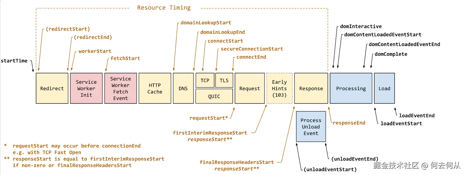 | Early Hints | firstInterimResponseStart - requestStart | 计算从请求开始到接收初始响应之间的时间。 |