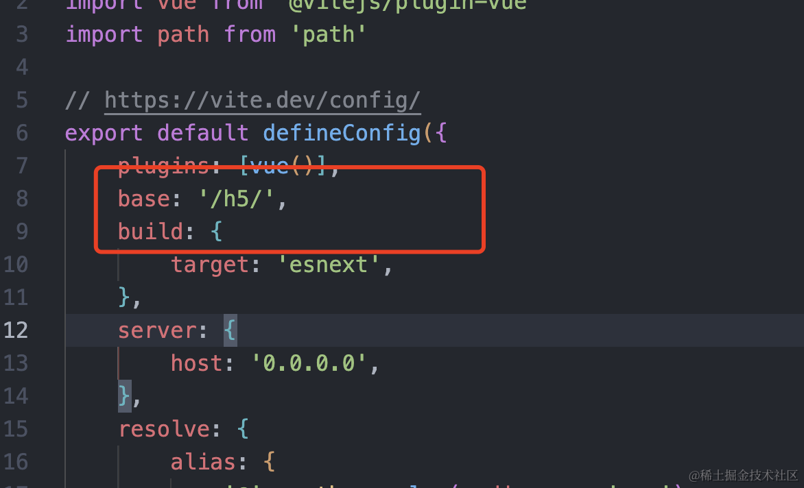 在 vite.config.js 中,确保 base 设置为 /h5/: