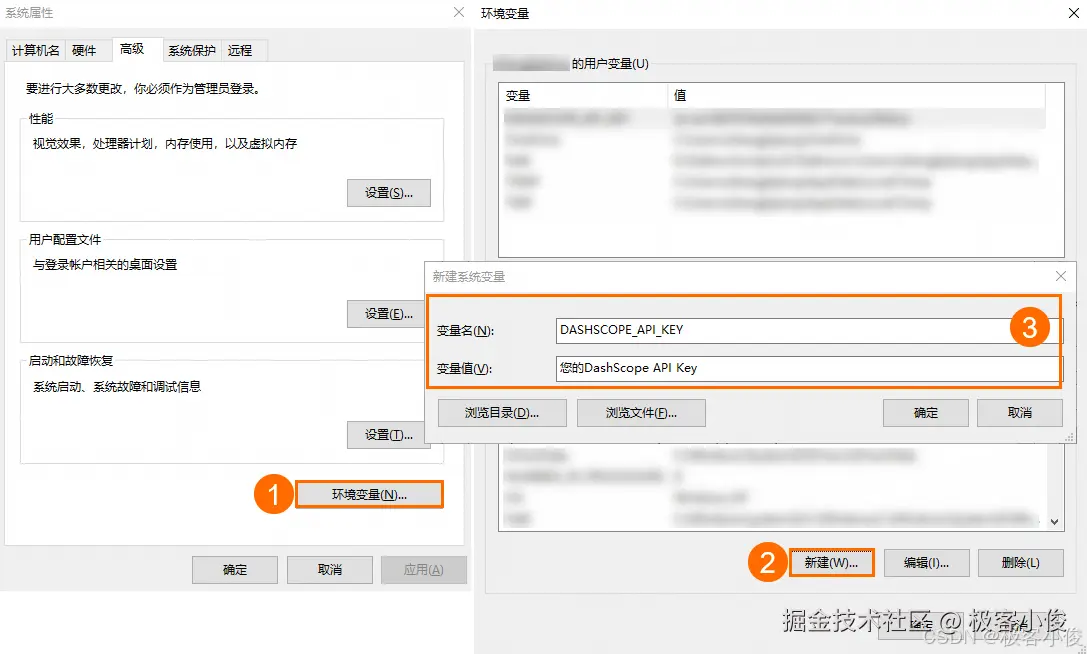 在系统属性窗口,单击环境变量,然后在系统变量区域下单击新建,变量名填入DASHSCOPE_API_KEY,变量值填入我们的API Key