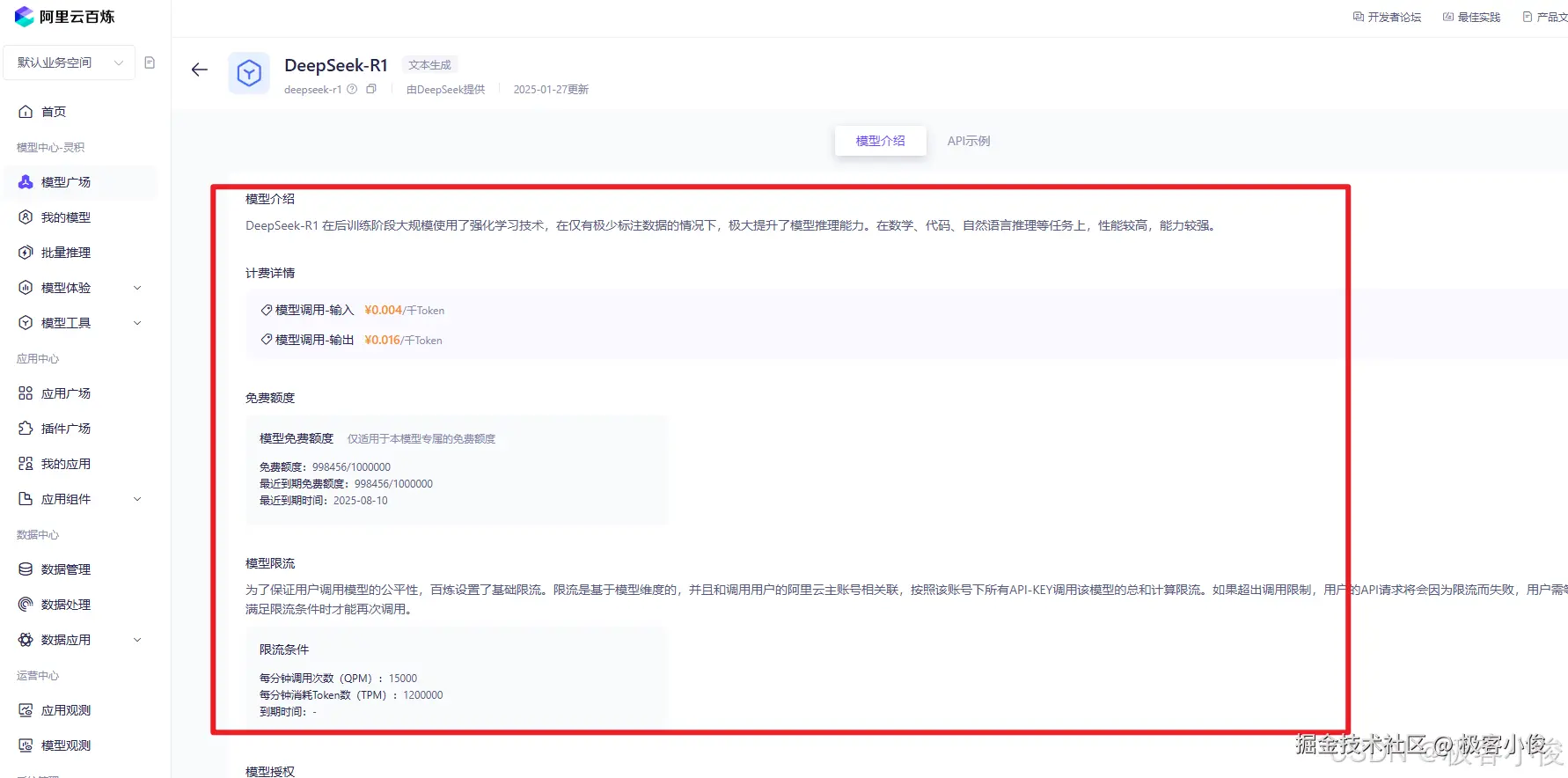 我们可以在该平台上找到并部署DeepSeek-R1满血版模型,享受其强大的数学、代码、自然语言等推理能力, 还可以找到特定尺寸的DeepSeek-R1蒸馏版模型的限时免费服务。这些服务旨在降低用户的使用门槛,促进AI技术的普及和应用!
