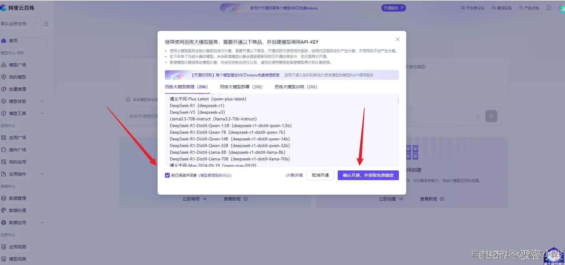 开通模型100万免费tokens服务