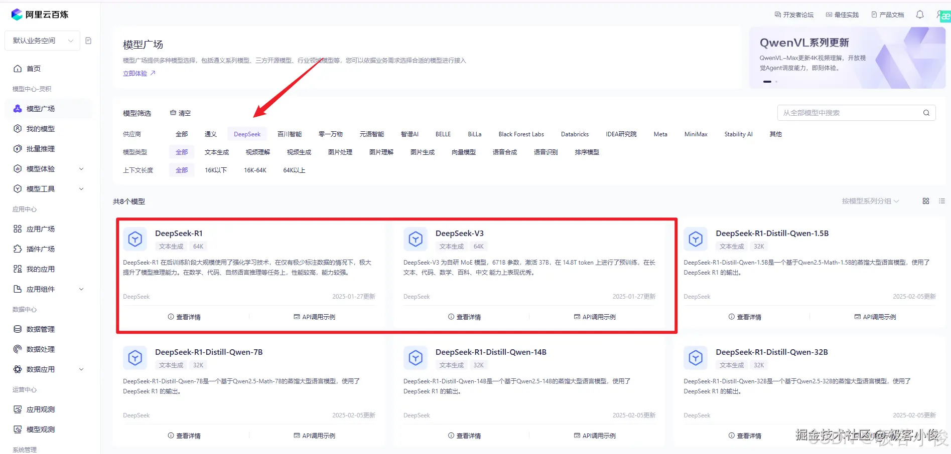 找到模型广场,然后筛选一下deepseek