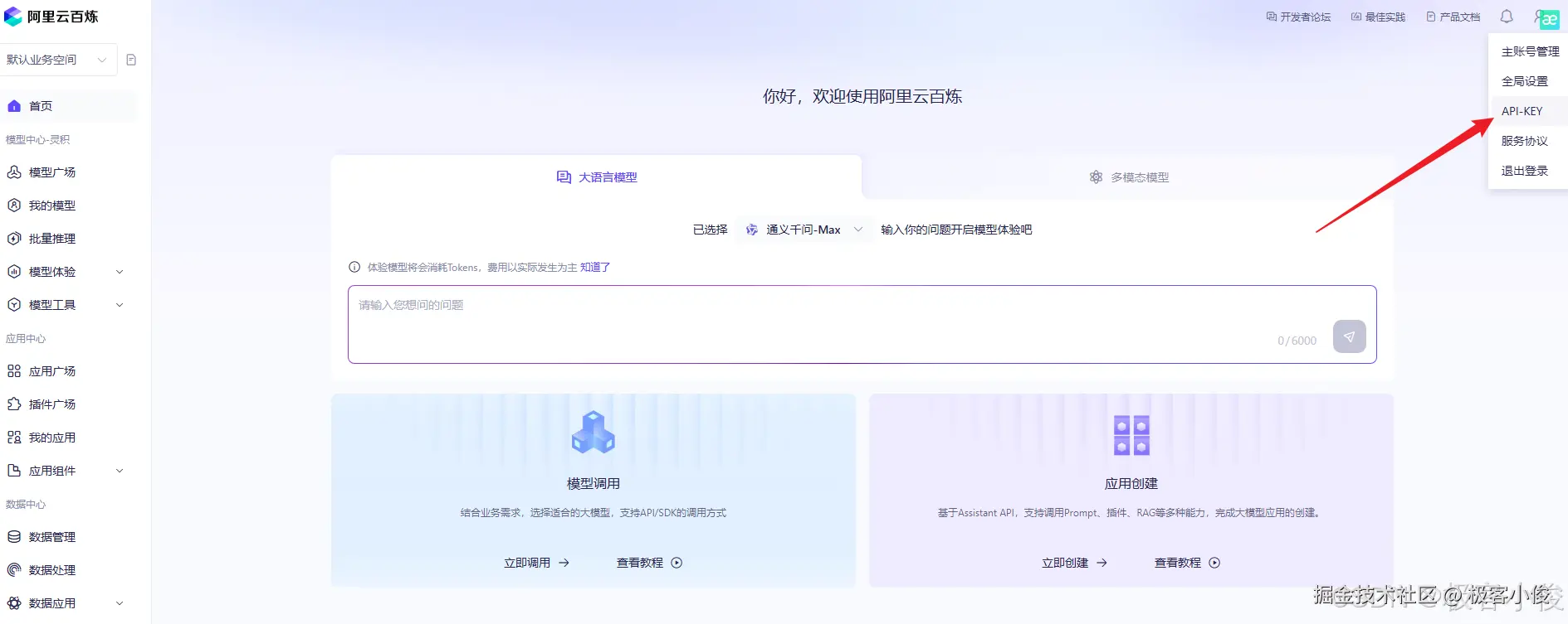 我们在阿里云百炼平台上鼠标悬停于页面右上角的用户图标,在下拉菜单中单击API-KEY