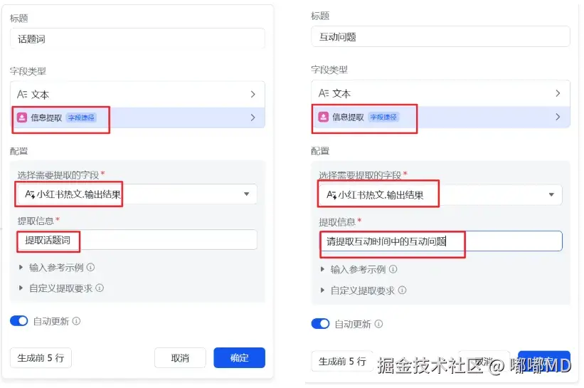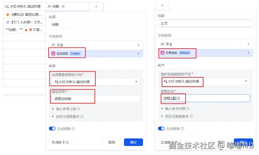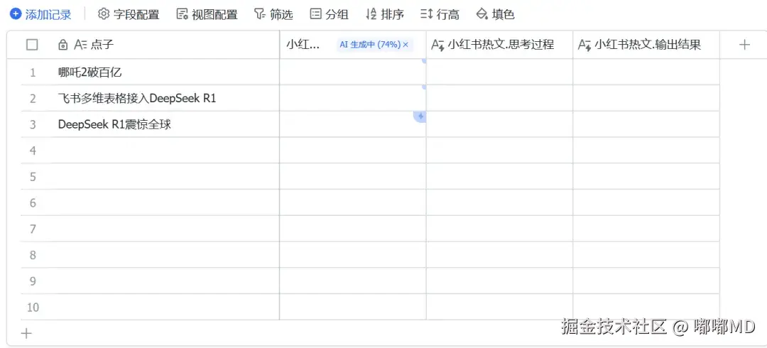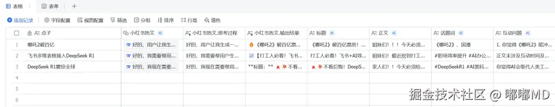 在上面生成好的基础上,我们还可以继续,再添加一些列,继续用DeepSeek R1 头里面的标题、正文、话题词、互动问题。