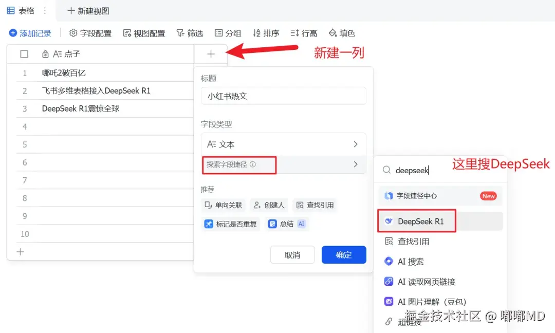 新增一列,然后选择 探索字段捷径,搜索DeepSeek R1 这个目前有免费额度可以使用,大家先直接用,飞书给每个人送了100万的Token,普通用户还是能用一阵子的。