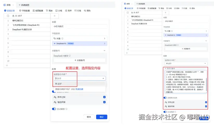 选中了后,要配置下指定内容,这里选择第一列的【点子】列 然后自定义要求这里,输入你的提示词,这个就是让DeepSeek-R1按这个来处理数据,然后勾选思考过程以及输出结果。 最后点击确认即可。