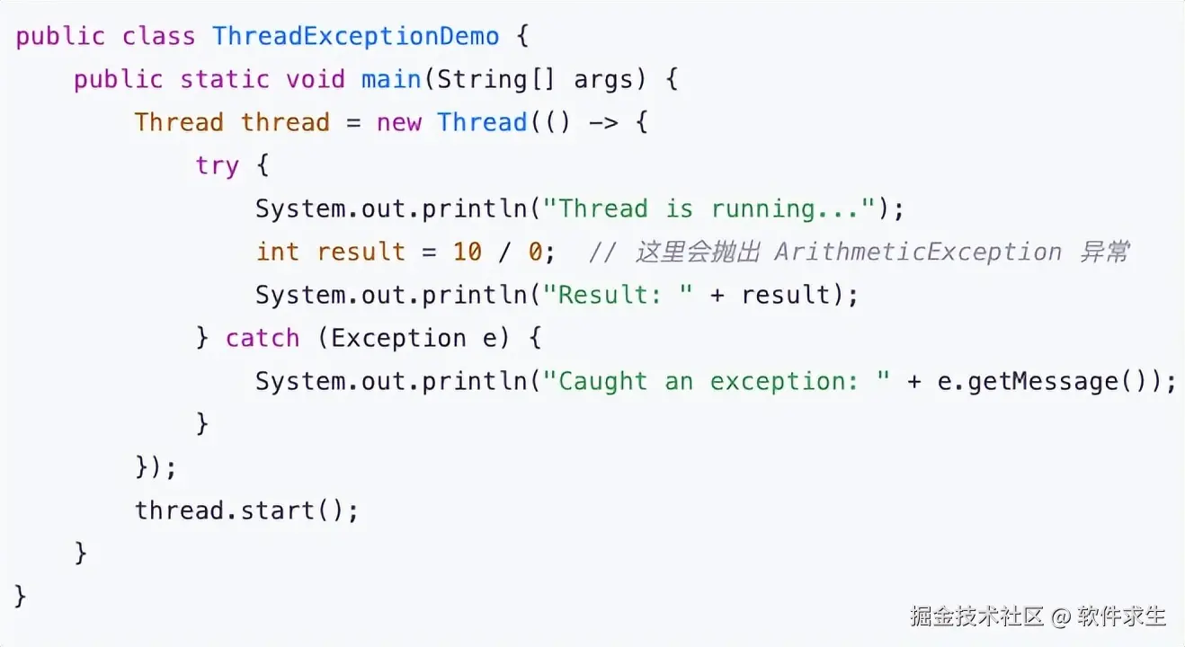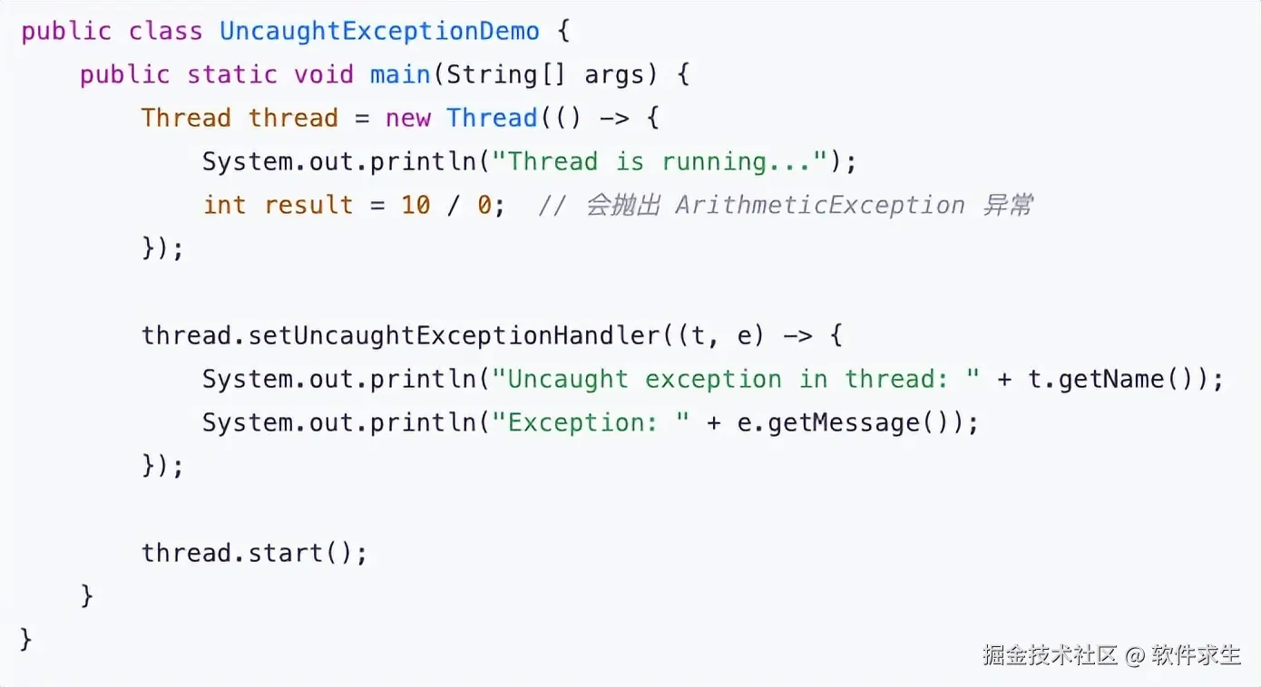 在上面的例子中,主线程创建了一个新的线程,在新线程中我们故意写了一个除零操作,导致了一个 ArithmeticException 异常。