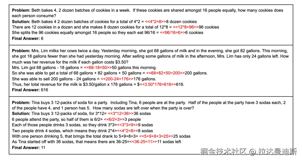GSM8K是一个包含 8500 道小学数学题的数据集。为了得出最终答案,模型必须使用 +、−、× 和 ÷ 等基本算术运算执行一系列(2 到 8 步)基本计算。顶尖的中学生应该能够解答所有问题。然而,即使是最大的模型也常常难以执行这些多步骤的数学任务。